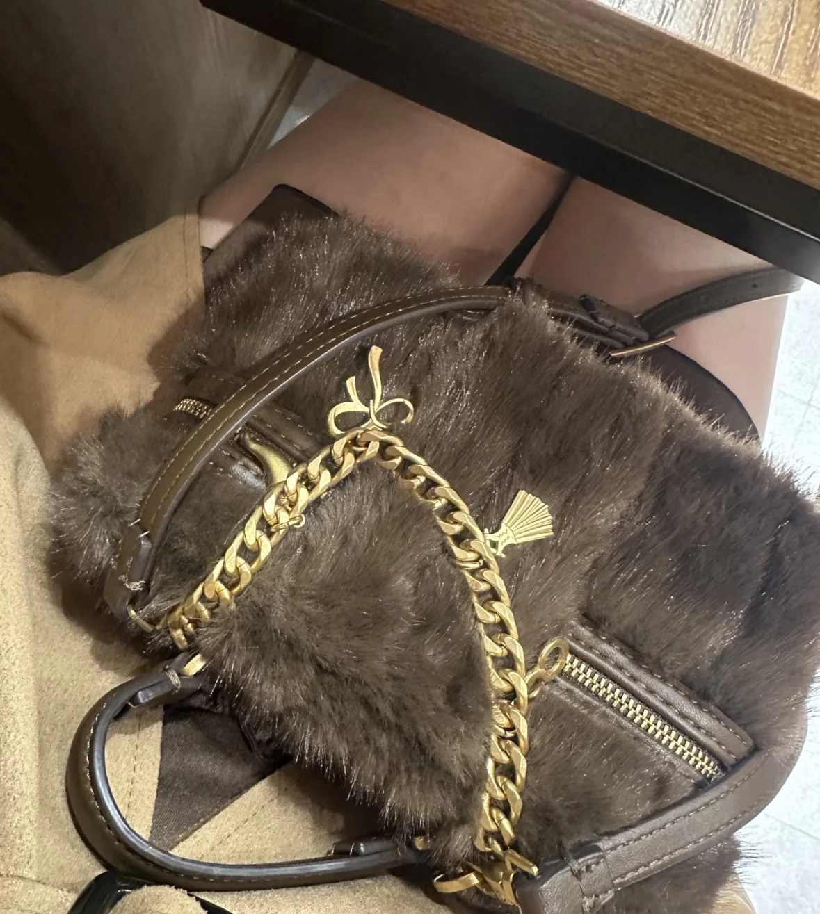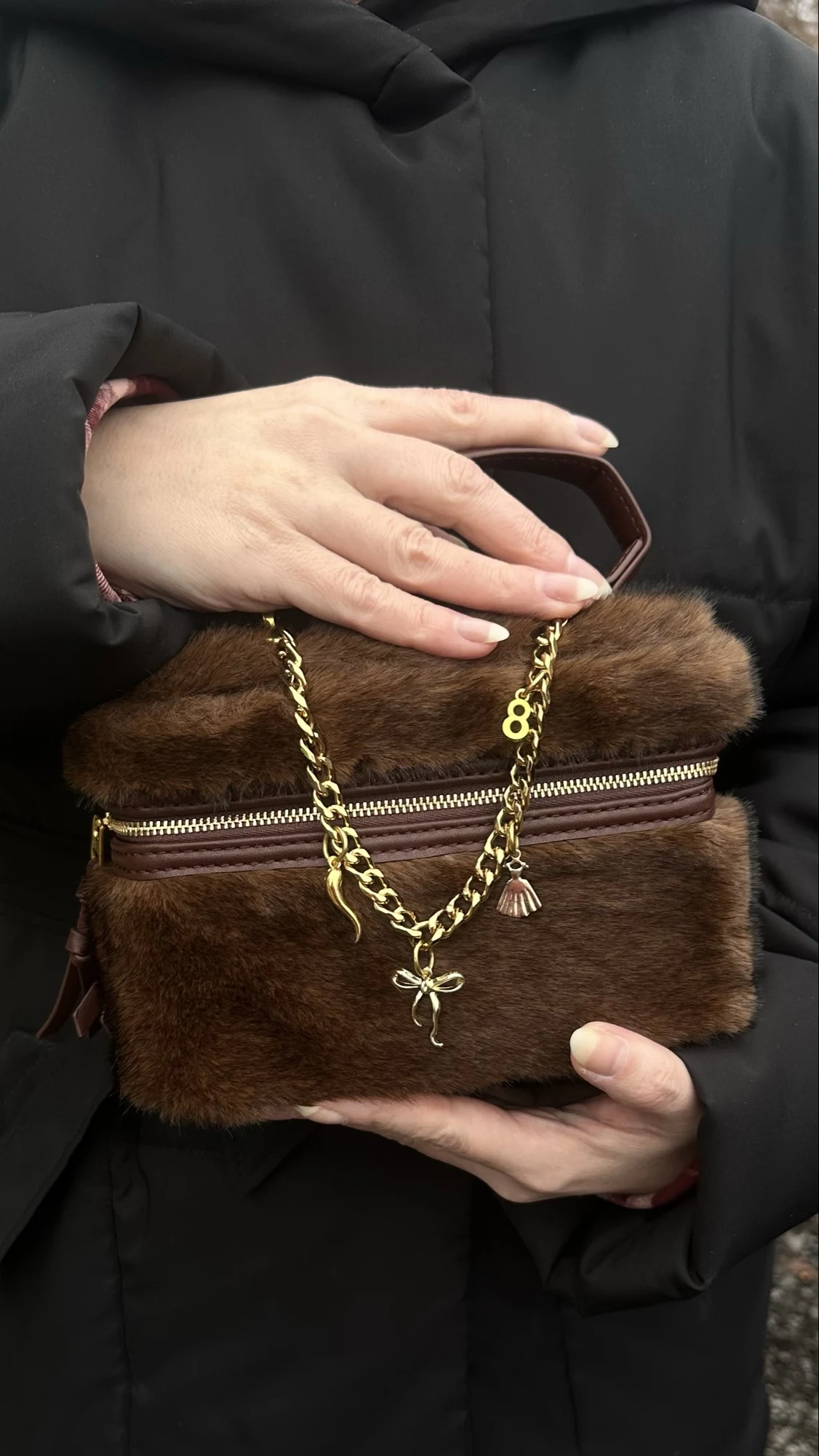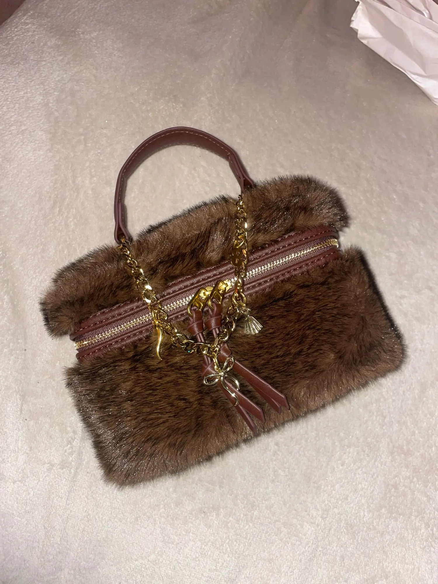 The Arvelle Fur-Charm Mini Box Bag reveals a gentle interplay of texture and form, where a plush fur surface meets a sculpted, meticulously balanced silhouette. Its soft contours create a sense of warmth and intimacy, while the gold-tone charm chain lends a graceful movement that catches the light with subtle elegance. Carried by hand, the piece introduces a refined touch to any ensemble, offering a quiet statement of character and modern femininity.