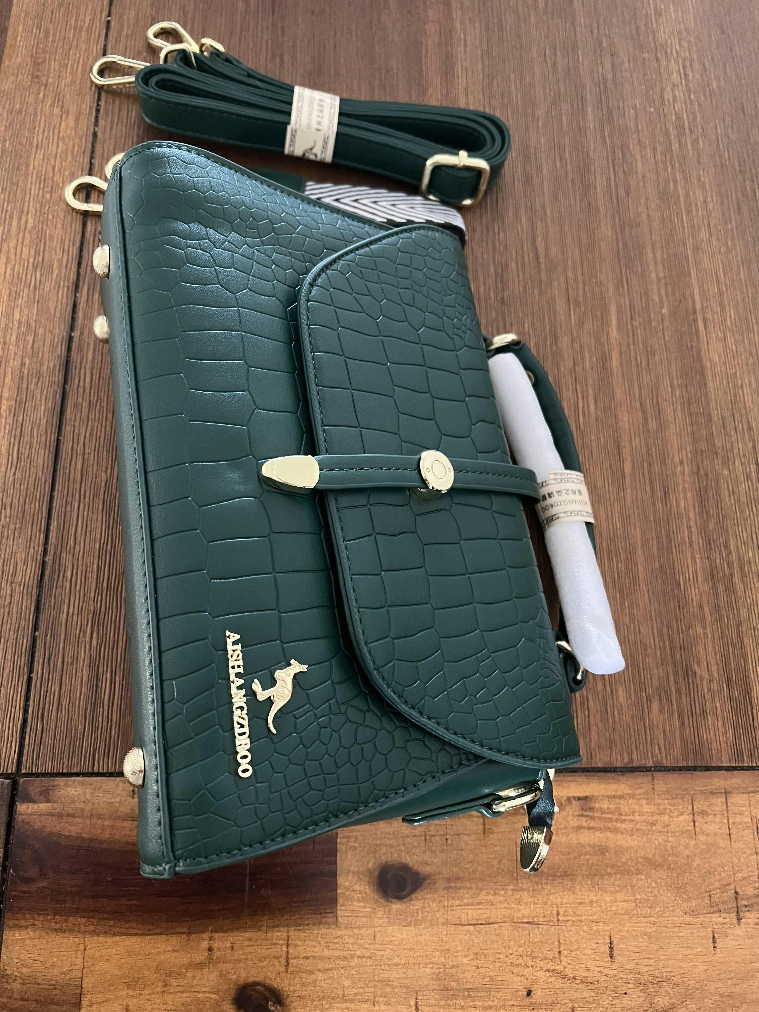 The Cirella Mini Satchel is a compact statement — sculpted in croc-embossed vegan leather with a tailored flap closure and slender top handle. Gold accents lend quiet strength to its refined structure, while the soft interior reveals just enough room for your daily rhythm: a phone, a wallet, a favorite lipstick.