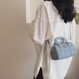 The Maelis Boston Mini revives the classic travel silhouette in a soft denim shell — redefined with compact proportions, tonal PU straps, and polished silver hardware. Its structured frame and subtle curve give it a vintage soul, while the lightweight design makes it perfect for spring city days or weekend strolls.