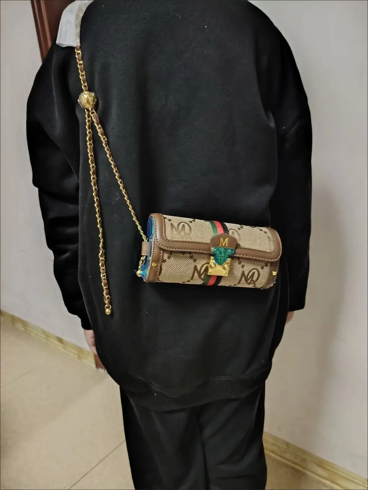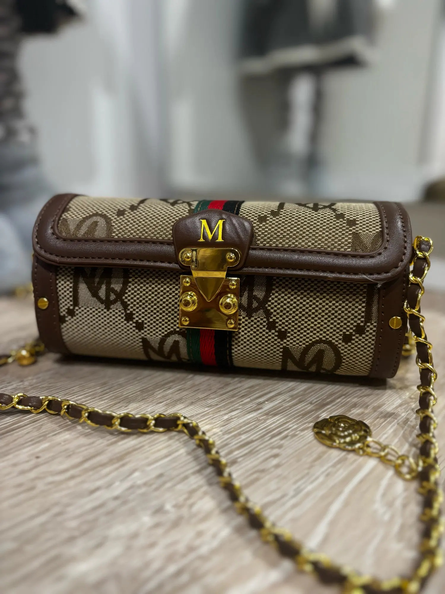 The Marquessa Chain Barrel Bag blends classic luxury cues with a sculptural, cylindrical silhouette — wrapped in a monogram-woven texture and framed by smooth leather edges. The bold gold chain strap becomes its signature: weighty, statement-making, and detailed with ornamental charms that catch the light with every movement.