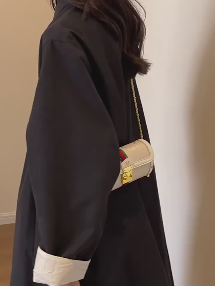 A polished front hasp closure secures your essentials, while the barrel form offers a perfectly compact space for your phone, cards, and night-out necessities. Its elongated shape feels refined in the hand or elevated on the shoulder — elegant enough for evenings, yet striking for daytime styling.