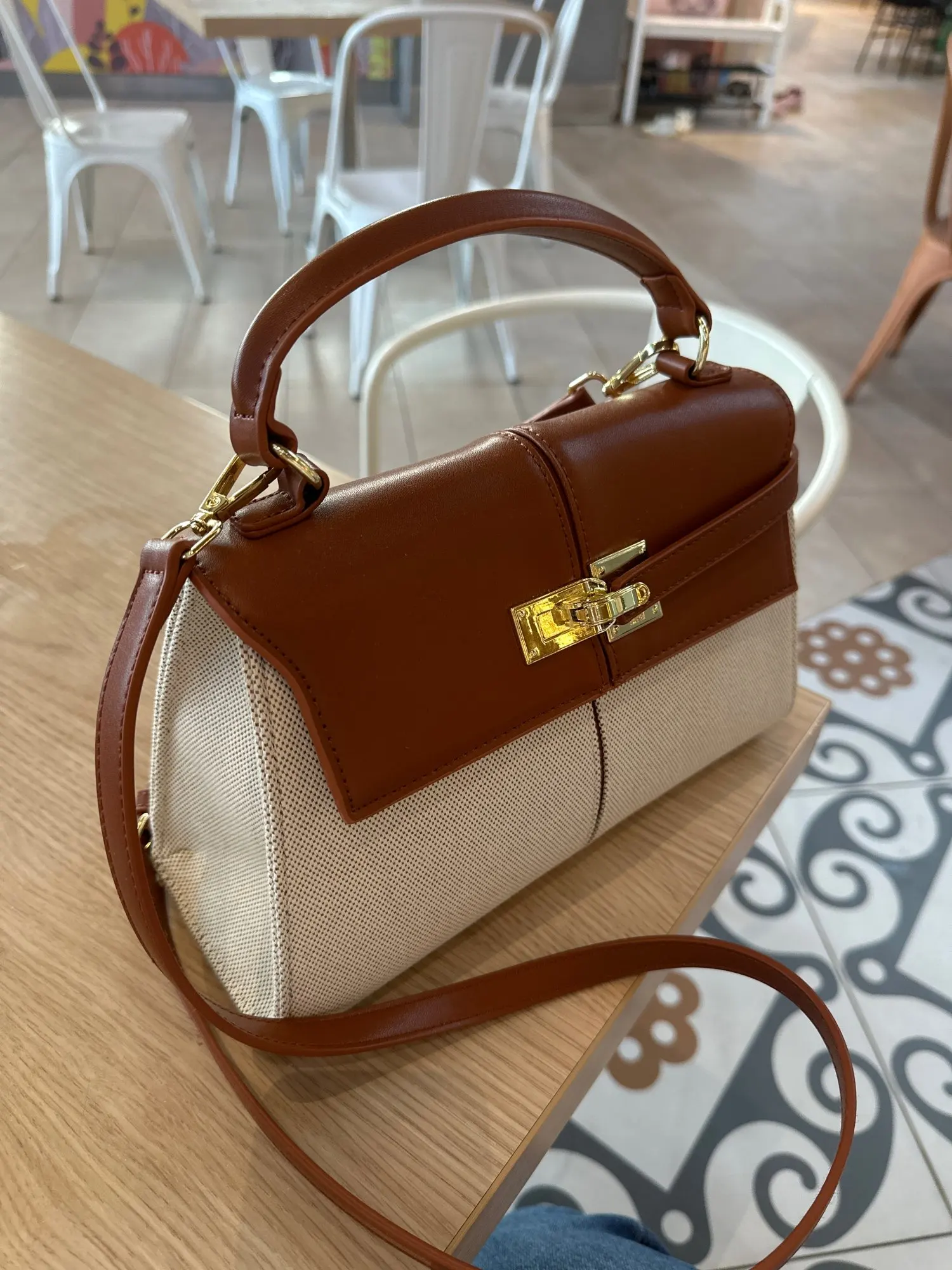 The Velmira Lock-Top Satchel evokes a heritage form reimagined with modern ease — merging canvas-textured sides with sleek faux leather and a gold clasp closure that nods to tradition while embracing now. Its trapezoidal lines suggest intention, not formality, offering refinement without effort.
